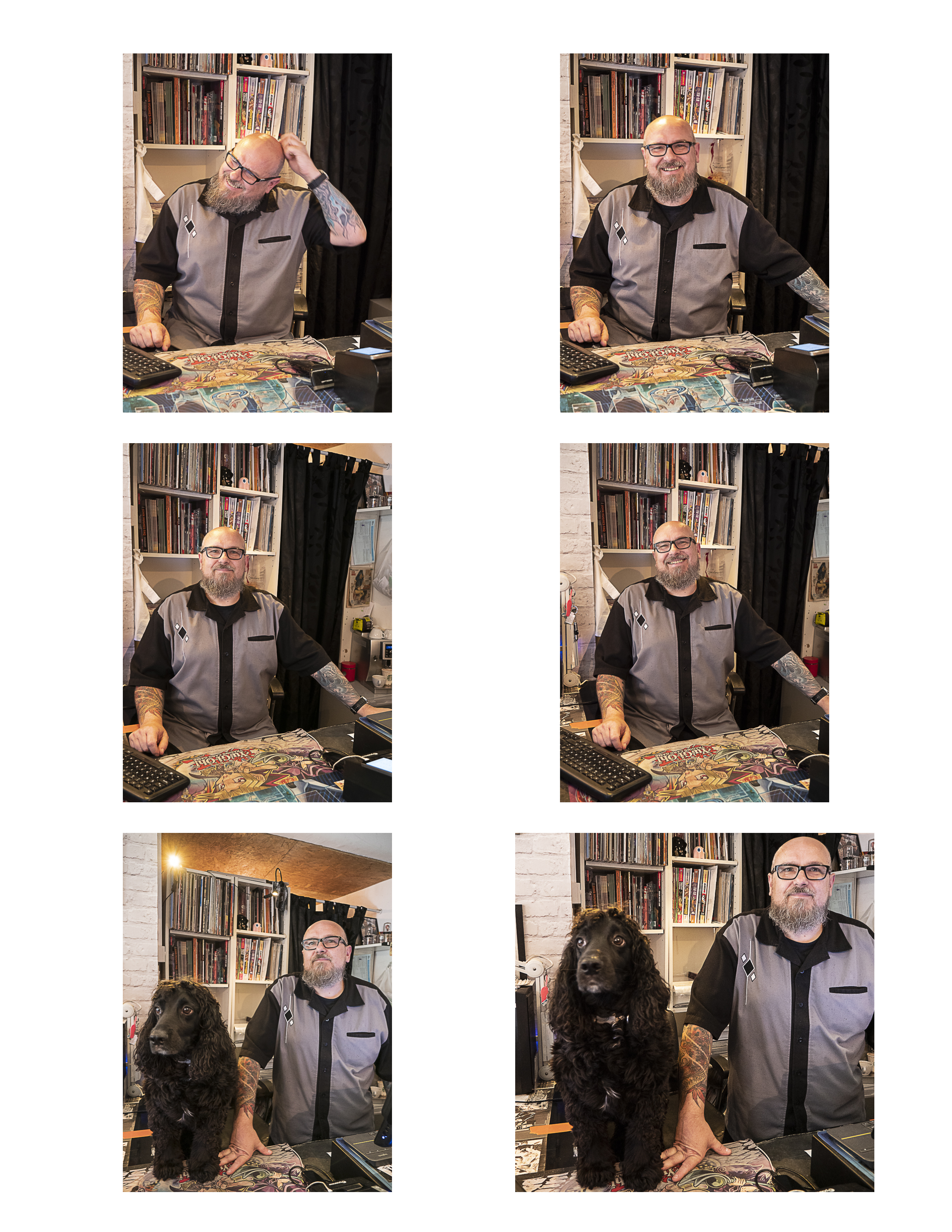 I chose to do an image of Alby. Alby is the owner of our local comic bookshop. He is also a photographer and is studying for a degree in photography at about the same stage I am at – so we have a lot of discussion about this. Alby is supported by his dog, Atticus, who is convinced the shop is there just for his personal gain, so he can get made a fuss of regularly. Atticus tried very hard to be the main subject of the mage and I have several pictures showing him in beautiful focus as he pushed Alby out of the way. We had some discussion about where to take the picture. The corner of the shop that Alby works in does not have the best lighting and is very cramped – but I decided that in spite of these drawbacks that area told the most about him and moving the shop around to get better light was not really practical. Ideally, I should have used flash – but I do not have a suitable set up, and we were also working when the shop was open, and around customers, so that did limit the flexibility of what I could do. This was, however, a useful learning experience about how to take images in limited circumstances. Alby started off trying to be very serious – which is not his usual self at all – and when teased by his family about it then tried to ‘make a smile’ which was also not very like his normal expression. Eventually I just decided to take a lot of images while talking to him, so that he relaxed enough to be natural. The whole shoot took about 45 minutes.