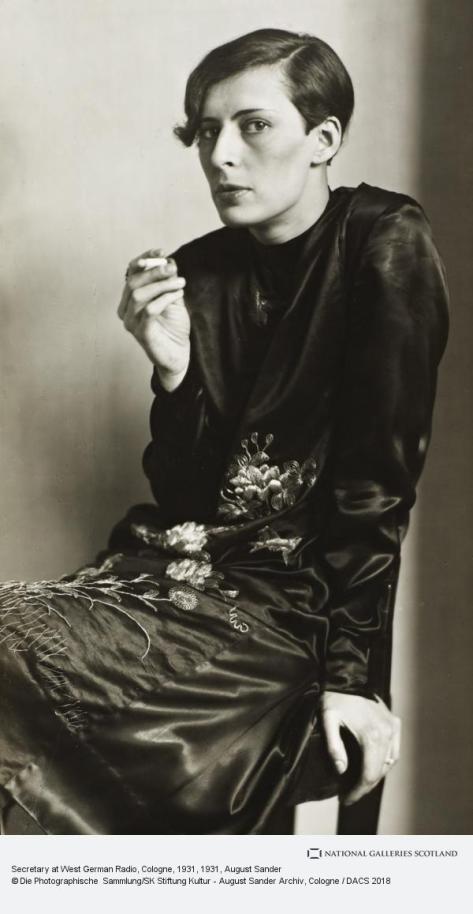 Secretary at West German Radio in Cologne, 1931. This earlier image is a complete contrast to the one above. It shows a person, that I initially thought from the hands and Adam’s apple was male, in what appears to be a floral dress. However, it is a woman, and was included as such in his portfolio. The National Gallery of Scotland website describes it as ‘Her dark silk dress decorated with floral embroidery, the secretary perches awkwardly with hunched shoulders on a wooden chair, smoking a cigarette. Her upheld right hand is drawn almost to her lips, which are slightly parted as if in exhalation. With her short hair, lipstick and carefully shaped eyebrows, this ‘Secretary at West German Radio in Cologne’ is a very fashionable woman, who may be seen as representing the ‘new’ woman of the day, much like Otto Dix’s painting ‘Portrait of the Journalist Sylvia von Harden’ (1926). The flat plane of the matt white wall behind her frames the gleaming satin folds of her garment, while Sander’s crop accentuates his subject’s tall thin frame, despite her slouched posture, in a portrait that emanates glamour and poise.’ All of the above I agree with; she is certainly very glamourous. She is shown in a commanding position. The only prop is a cigarette. The focus is on her eyes. There is an alternate image of her in a slightly different pose that looks much softer and more feminine.